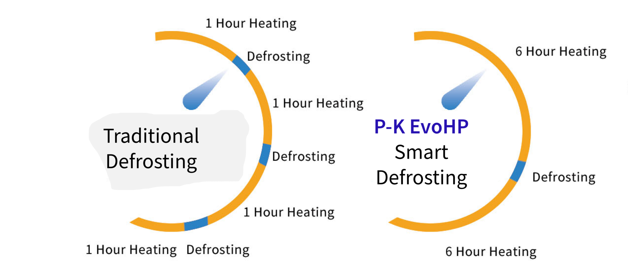 P-K EvoHP utilizes intelligent defrosting technology, which can determine whether to defrost according to the operating conditions, ambient temperature, and frost density, which greatly extends the defrost cycle and reduces defrosting time by more than 20%. As a result, the unit operates with optimal heating capacity and energy efficiency.
