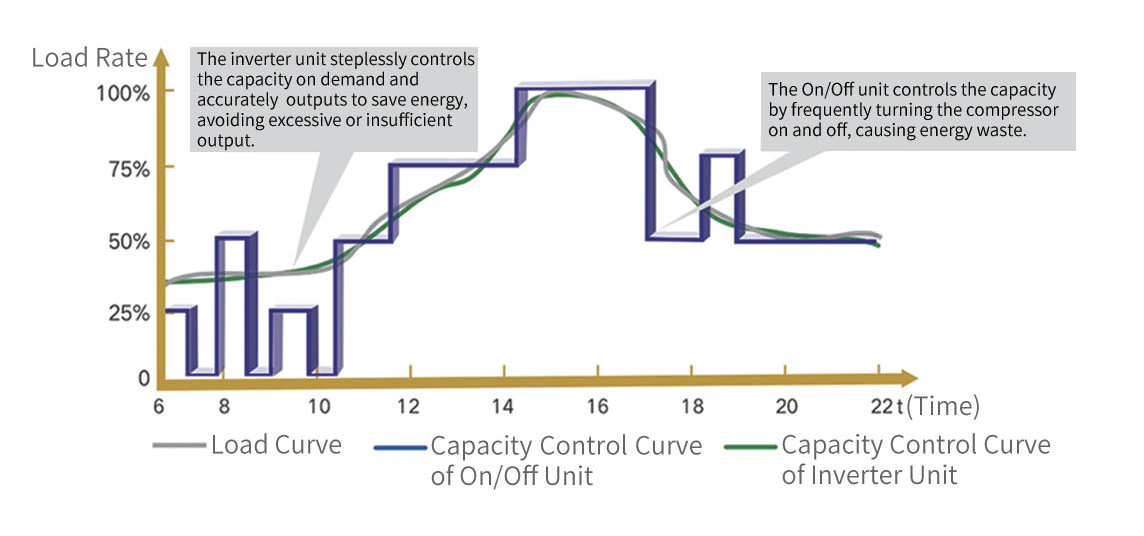 Unlike traditional multi-compressor on/off systems, our inverter compressor smoothly adjusts its speed, seamlessly transitioning between loading and unloading operations without the unnecessary compressor starts and stops. This means reduced energy consumption and optimal performance, every time.